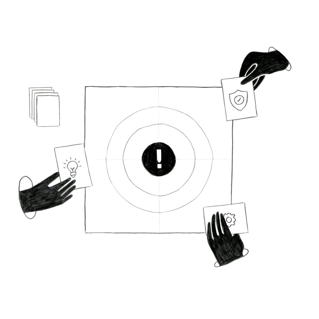 The dilemma games presented participants with realistic cybersecurity dilemmas present in the empirical material. Players used colour-coded “resource cards” representing technical fixes, management changes, people involvement, and knowledge gathering to explore possible solutions, and were moreover encouraged to add their own “resource cards” in order to solve the problem.